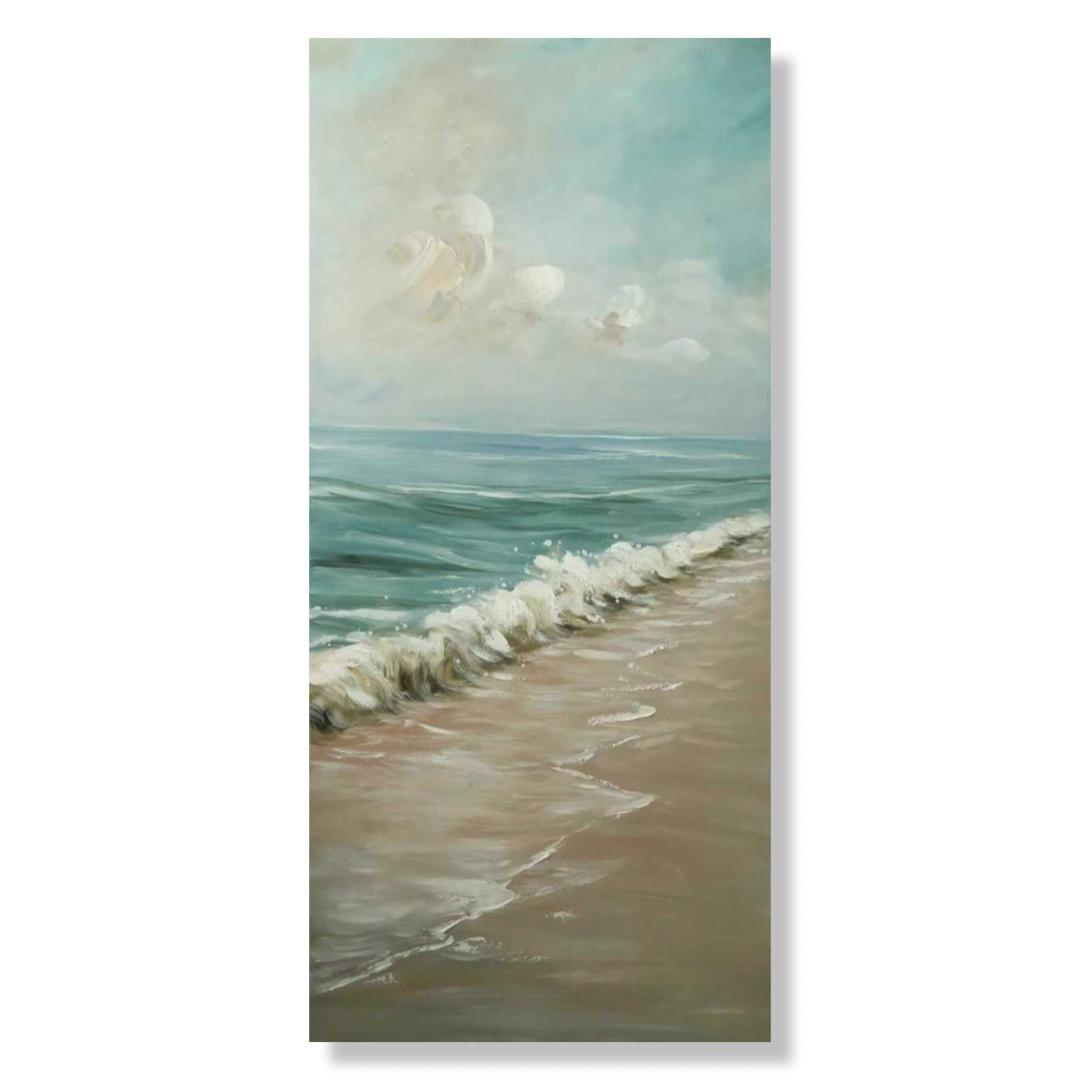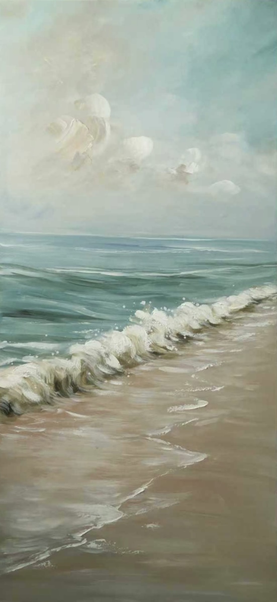 „Break“ fängt die Kraft und Bewegung in dem Moment ein, in dem die Welle auf die Küstenlinie trifft und bricht. Mit lebendigen Pinselstrichen und einer sanften Farbpalette aus Türkis-, Sand- und hellen Himmelstönen entsteht ein Gefühl von Präsenz – als stünde man selbst am Wasser und spüre den Rhythmus des Meeres. Der aufsprühende Schaum verleiht dem Gemälde Energie, während das Gesamtbild gleichzeitig ruhig und harmonisch wirkt.