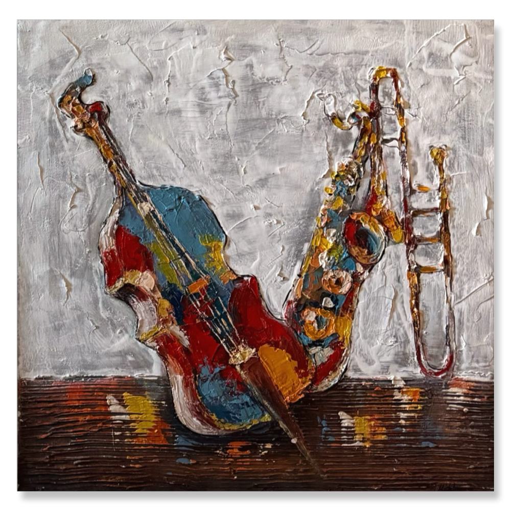 Hier ist ein farbenfrohes Gemälde mit einem kleinen Streichinstrument, einem Saxophon und einer Posaune. Bilder mit Musikinstrumenten sind besonders beliebt bei Kunstliebhabern, die ihre Wände gerne mit einzigartigen Motiven schmücken.