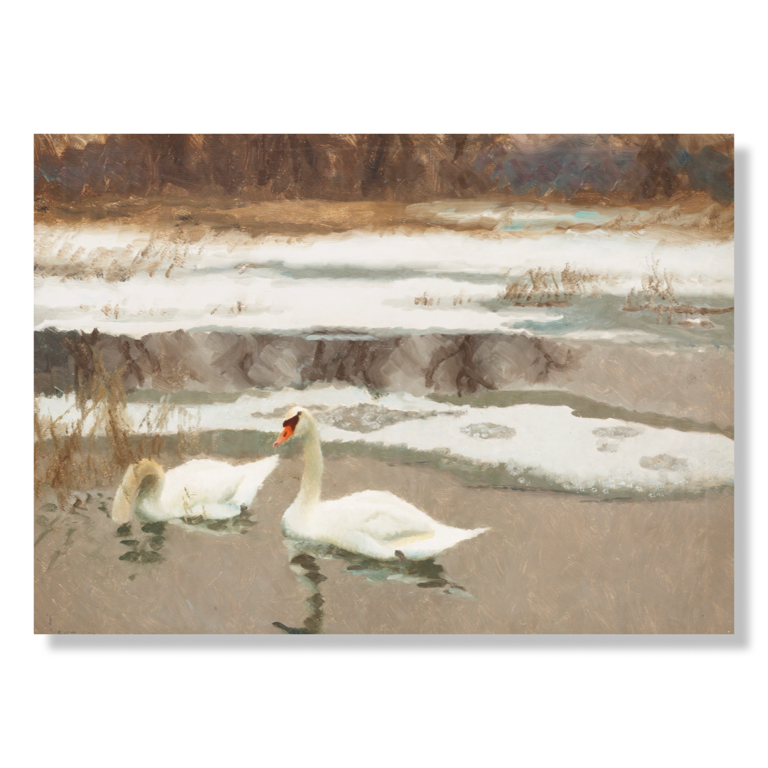 Liljefors war ein Meister darin, Tiere in ihrer natürlichen Umgebung darzustellen – ohne Romantisierung oder Symbolik. In Swans treffen Bewegung und Ruhe aufeinander, während die weichen Formen der Vögel mit den gedämpften Strukturen von Eis und Ufer kontrastieren. Die Farbpalette ist zurückhaltend und harmonisch, mit erdigen Tönen, die einen ruhigen, zeitlosen Ausdruck schaffen.