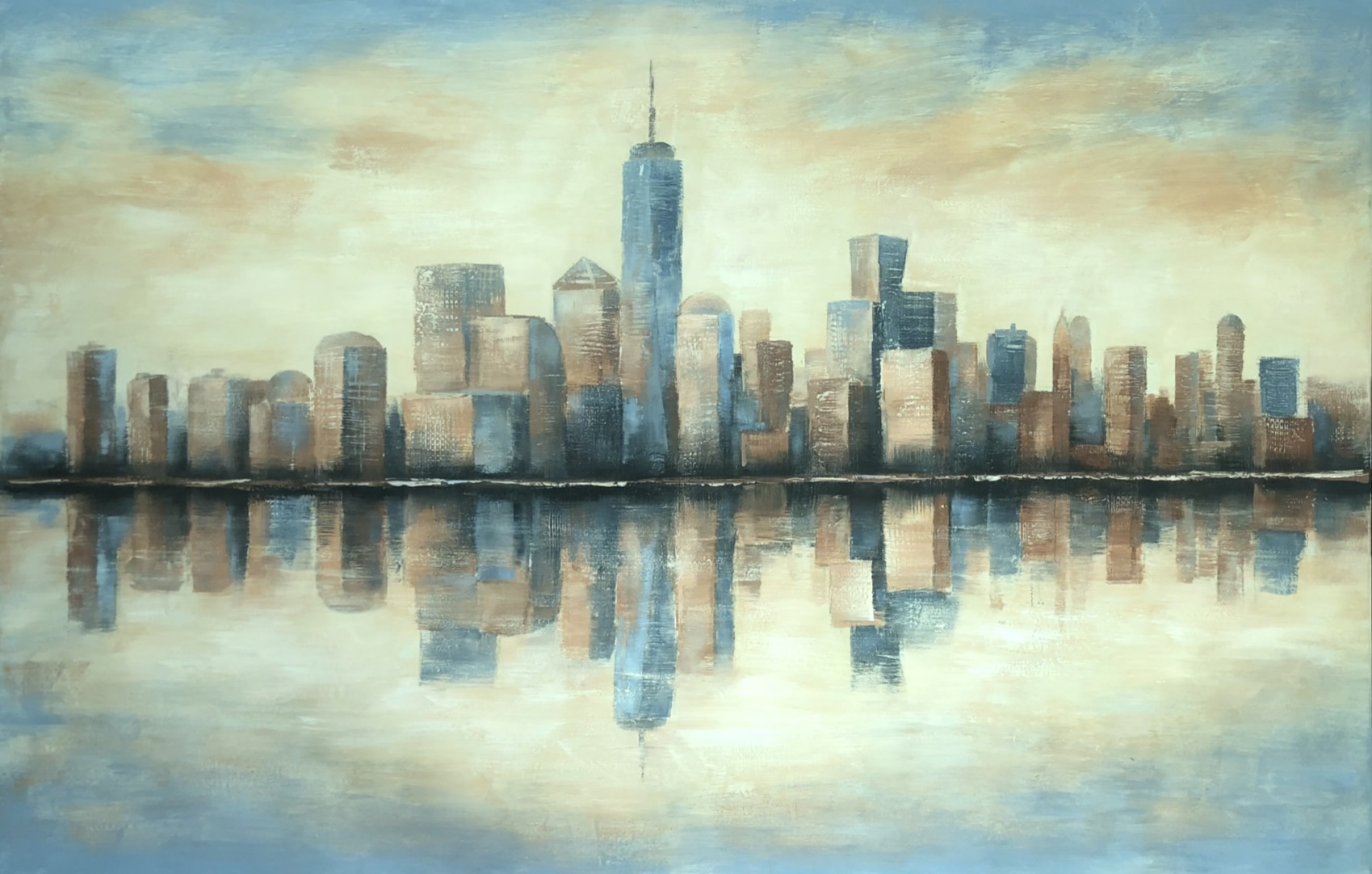 Ein elegantes Gemälde einer Skyline mit Spiegelung im Wasser – wo sich zwei Welten in Licht, Balance und Harmonie begegnen.