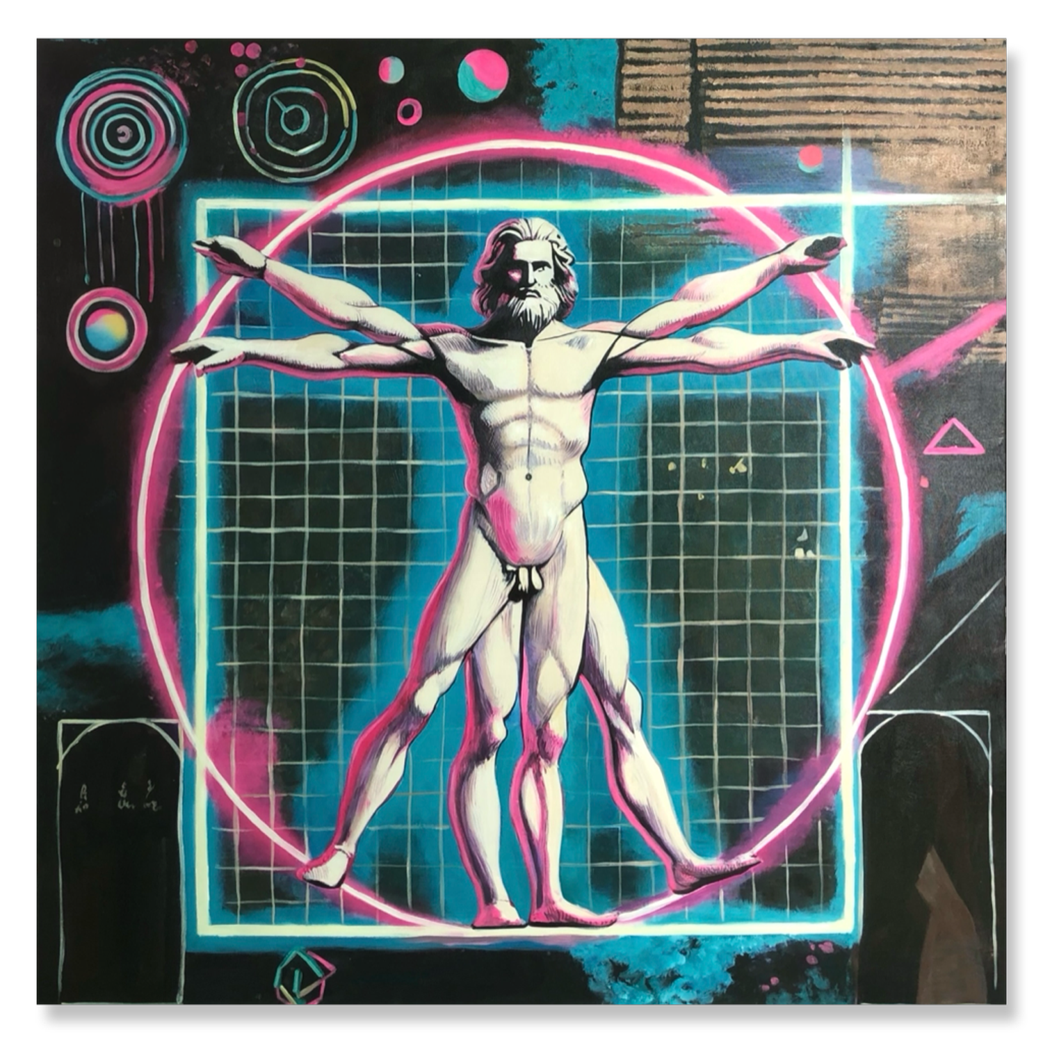 Vitruvian Redux ist eine Hommage an Leonardo da Vincis ikonische Idee der menschlichen Proportionen – doch hier tritt das alte Ideal in eine neue Zeit ein. Il Scimmia nimmt die klassische Figur und versetzt sie in eine Welt, in der die Grenzen des Möglichen ständig verschoben werden. Der moderne Mensch steht nicht länger still in einem starren Raster von Wahrheiten; er drängt gegen die Rahmen, bricht aus ihnen aus und zeichnet neue.